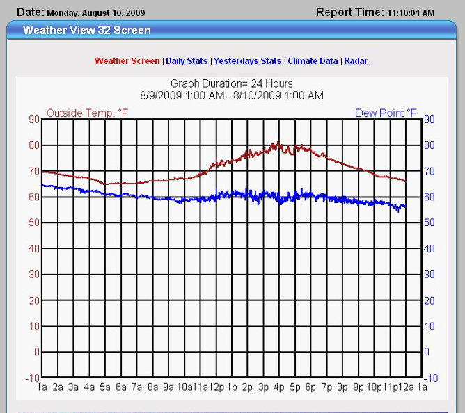 Now you can check on the Saint Peter weather from the comfort of your home. The Geography Department has operated a campus weather station for decades. Students use the data for projects during GEG-108: Weather and Climate and for research projects on solar power, wind energy, hydrology, and plant growth in Saint Peter. But in 2008, we started putting the data online. The main focus is daily climate data (maximum and minimum temperatures, dewpoints, wind speed, rainfall, and so forth). There are some bugs with the updating of the graphs that we hope to work out soon.